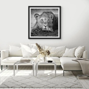 Poster în ramă neagră - Un leu tânăr în tonuri monocromatice - 50x70cm - Pisicuța regală - Decorațiune modernă pentru perete pentru living și dormitor ARTTOR