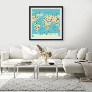 Poster în ramă neagră - O hartă a lumii cu ilustrații ale animalelor din diferite regiuni - 50x70cm - Vecini buni - Decorațiune modernă pentru perete pentru living și dormitor ARTTOR