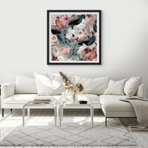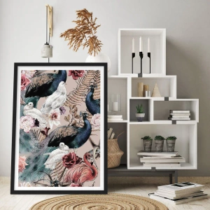 Poster în ramă neagră - Păsări și flori colorate pe un fundal bej - 50x70cm - În grădina palatului - Decorațiune modernă pentru perete pentru living și dormitor ARTTOR