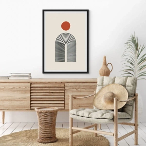 Posterul combină simplitatea și armonia, folosind geometria și contrastele pentru a crea o compoziție unică. Cercul roșu adaugă energie și claritate, în timp ce liniile care formează arcul introduc echilibru și ordine. Această operă de artă adaugă o notă modernă și o liniște estetică interiorului.