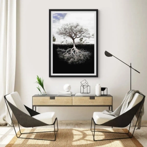 Poster în ramă neagră - Un copac minimalist cu un sistem radicular vizibil - 50x70cm - Descoperire - Decorațiune modernă pentru perete pentru living și dormitor ARTTOR