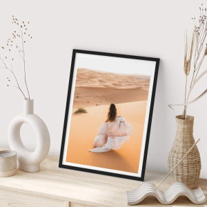 Poster în ramă neagră - O femeie într-o rochie lejeră în deșert - 50x70cm - Evadare spre libertate - Decorațiune modernă pentru perete pentru living și dormitor ARTTOR