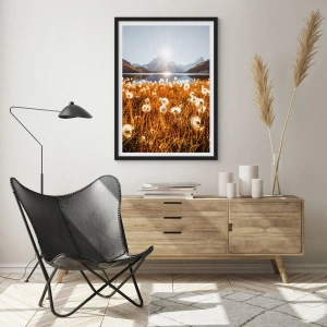Poster în ramă neagră - O pajiște cu flori albe pe fundalul unui lac și al munților la apus - 50x70cm - Duritatea rocilor, moliciunea ierbii - Decorațiune modernă pentru perete pentru living și dormitor ARTTOR