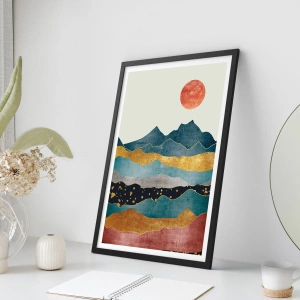 - Posterul prezintă munți abstracți în nuanțe de auriu, albastru și roșu, creând o compoziție armonioasă. Culorile calde și forma geometrică îi conferă un aspect elegant.