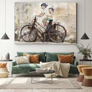 - O imprimare pe pânză care înfățișează o bicicletă și un desen pentru copii pe un perete vechi, combinând arta stradală cu farmecul urban.