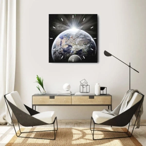 Ceas de perete - Ceas pe sticlă - Vedere a Pământului la răsăritul soarelui în spațiul cosmic - 30x30cm - În plină strălucire - Decorațiune modernă pentru perete pentru living, bucătărie și dormitor ARTTOR