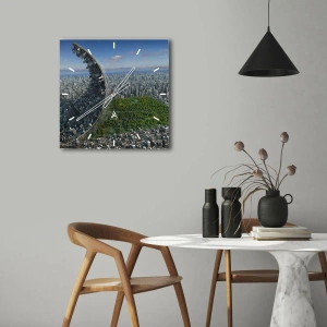 - Acest ceas de perete înfățișează un oraș futurist cu o structură fragmentată și verdeață în fundal. Un motiv interesant pentru iubitorii de arhitectură modernă și viziuni despre viitor.