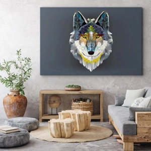 Tabloul pe pânză „Imagine geometrică a unui lup pe fundal gri” este o propunere pentru cei care apreciază decorațiunile interioare moderne și expresive. Compoziția prezintă o imagine stilizată a unui lup, concepută într-un stil geometric, în care formele colorate creează un întreg armonios pe un fundal neutru, gri.