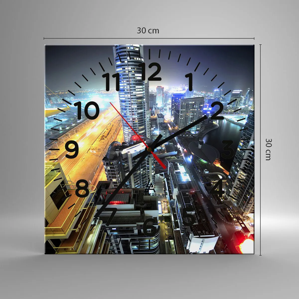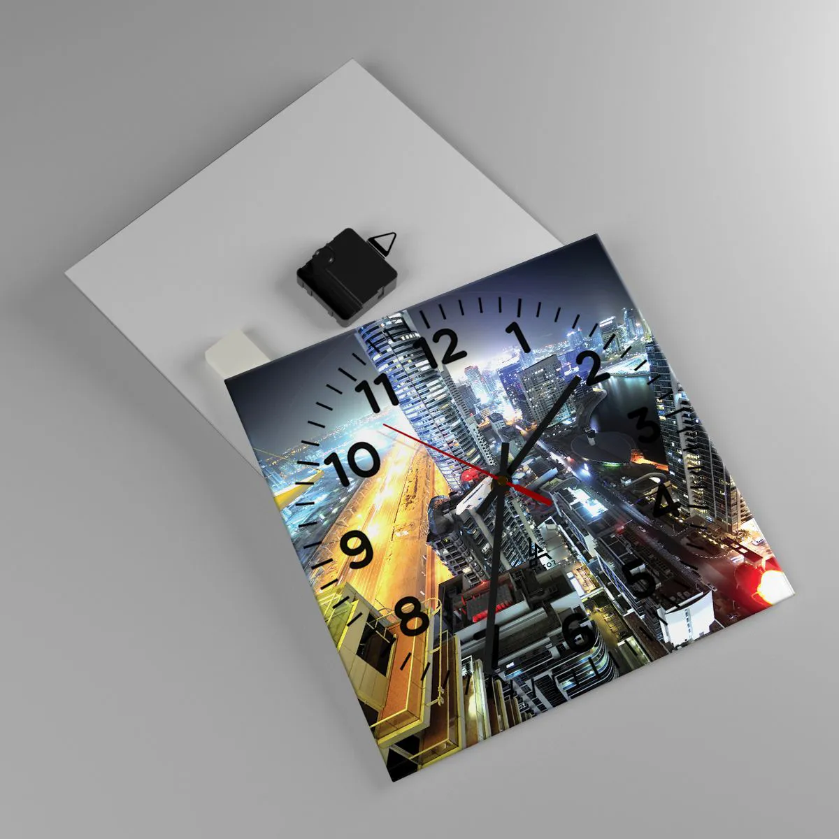 Ceasul este fabricat din sticlă securizată de 4 mm grosime. Tehnologia de fabricație a ceasului respectă clasa de siguranță 2B2 conform EN 12600:2004, care garantează rezistența la impact. Ceasul din sticlă este gata de agățat - are o agățătoare metalică fixată la partea din spate a ceasului și un distanțier din spumă pentru a regla distanța uniformă a ceasului față de perete. Ceasul are un mecanism silențios care funcționează cu ajutorul unei baterii AA de 1,5 V (nu este inclusă).