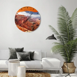- Acest ceas de perete unic înfățișează un canion pitoresc cu formațiuni stâncoase roșii și un cer albastru. O decorațiune perfectă pentru iubitorii de natură și peisaje unice.