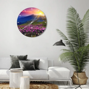 - Acest ceas de perete prezintă un peisaj montan la apus, cu flori înflorite. O piesă decorativă care aduce pace și armonie oricărui interior.