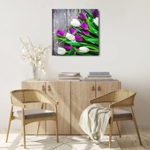 Ceas de perete - Ceas pe sticlă - Un buchet de lalele mov și albe pe un fundal de lemn - 30x30cm - În ziua festivalului de primăvară - Decorațiune modernă pentru perete pentru living, bucătărie și dormitor ARTTOR