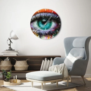 Ceas de perete - Ceas pe sticlă - Grafică abstractă a ochilor într-un stil geometric multicolor - 30x30cm - Strălucire cristalină a ochilor - Decorațiune modernă pentru perete pentru living, bucătărie și dormitor ARTTOR