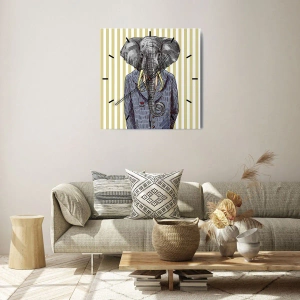 Ceas de perete - Elegant prin natură - Desen elegant al unui elefant în costum pe un fundal cu dungi verticale