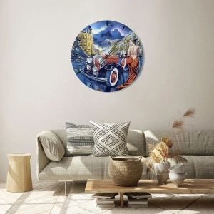 • Acest ceas de perete elegant prezintă o femeie într-o rochie portocalie stând lângă o mașină clasică, pe fundalul luminilor orașului. Un plus unic pentru interioarele în stil vintage.