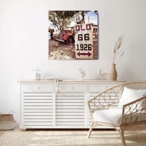 Ceas de perete - Ceas pe sticlă - O mașină de epocă în fața unui indicator pe Ruta 66 și a unei plăci de lemn. - 30x30cm - O legendă provincială americană - Decorațiune modernă pentru perete pentru living, bucătărie și dormitor ARTTOR