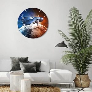 Un ceas de perete cu un design futurist, care înfățișează o vedere extraordinară a unei nave spațiale plutind deasupra Pământului, pe un fundal plin de stele. Acest motiv unic aduce un stil modern interiorului și inspiră explorarea lumilor necunoscute.