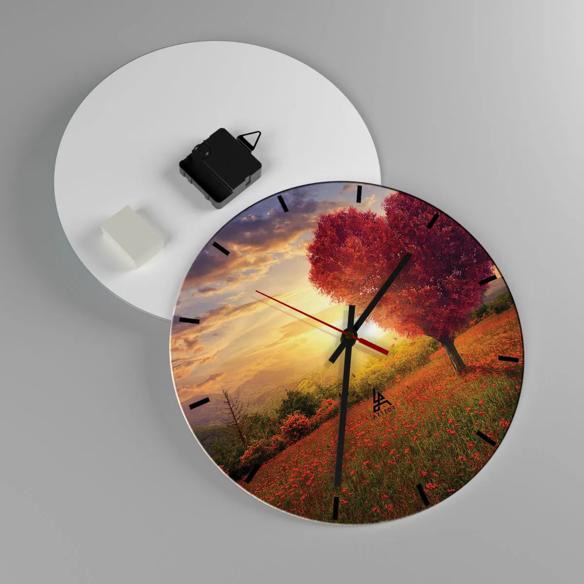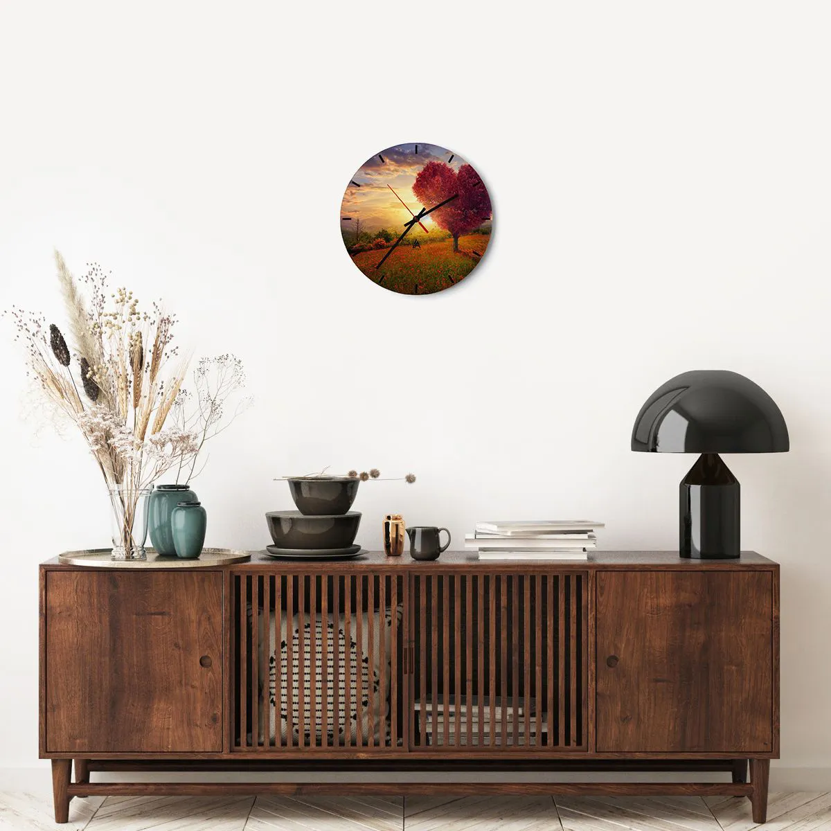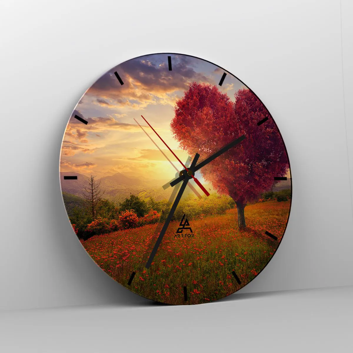 - Acest ceas de perete înfățișează un peisaj pitoresc cu un copac roșu în formă de inimă la apus. Perfect pentru interioare romantice.