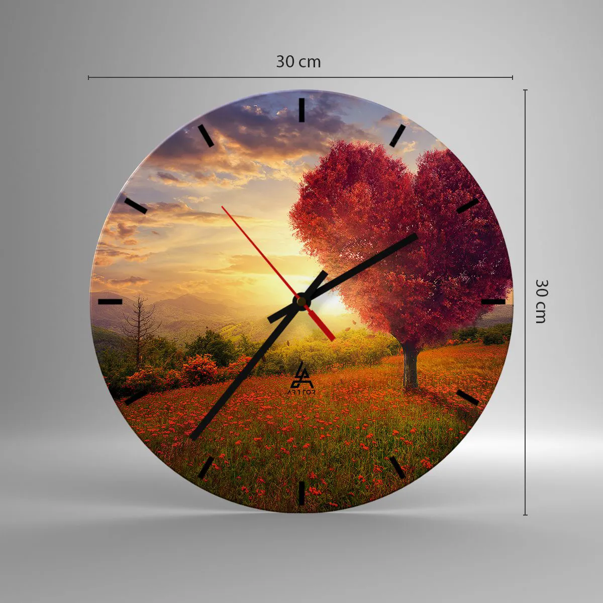 Ceas de perete - Ceas pe sticlă - Peisaj cu un copac roșu în formă de inimă la apus - 30x30cm - Te apucă inima - Decorațiune modernă pentru perete pentru living, bucătărie și dormitor ARTTOR