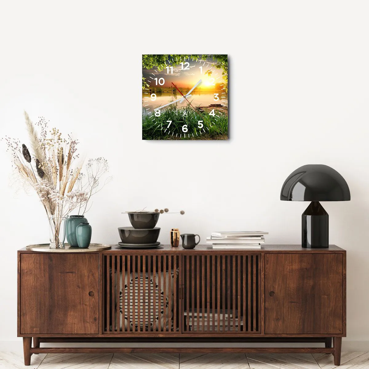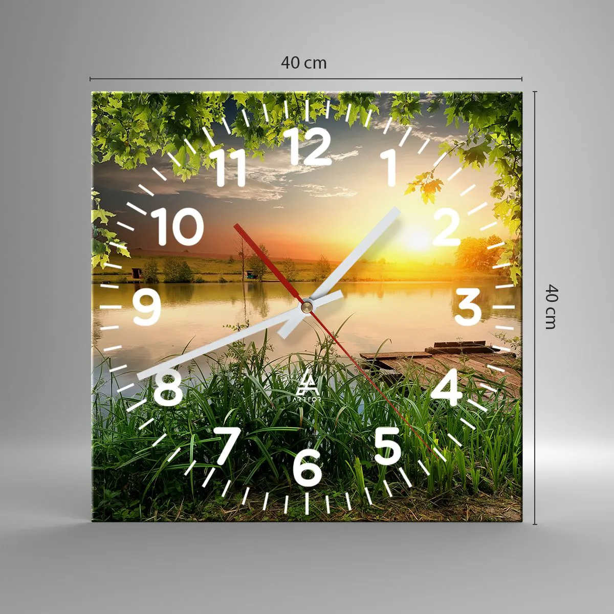 Ceas de perete - Ceas pe sticlă - Peisaj într-un cadru verde - 40x40 cm