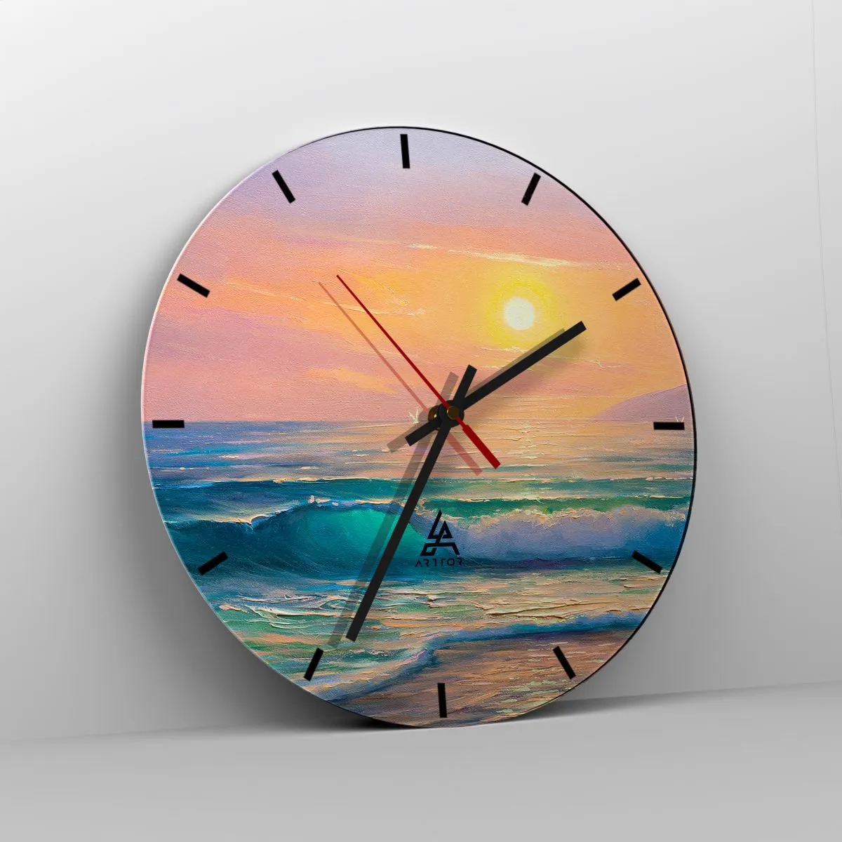 „Cântecul valurilor turcoaz” este un ceas de perete unic care înfățișează o vedere pitorească a unui apus de soare peste un ocean calm. Imaginea emană căldură și armonie datorită tranzițiilor subtile de culoare de pe cer și valurilor blânde care adaugă dinamică. Acest motiv aduce în interior o atmosferă de relaxare și apropiere de natură, încântând prin bogăția detaliilor și intensitatea culorilor.