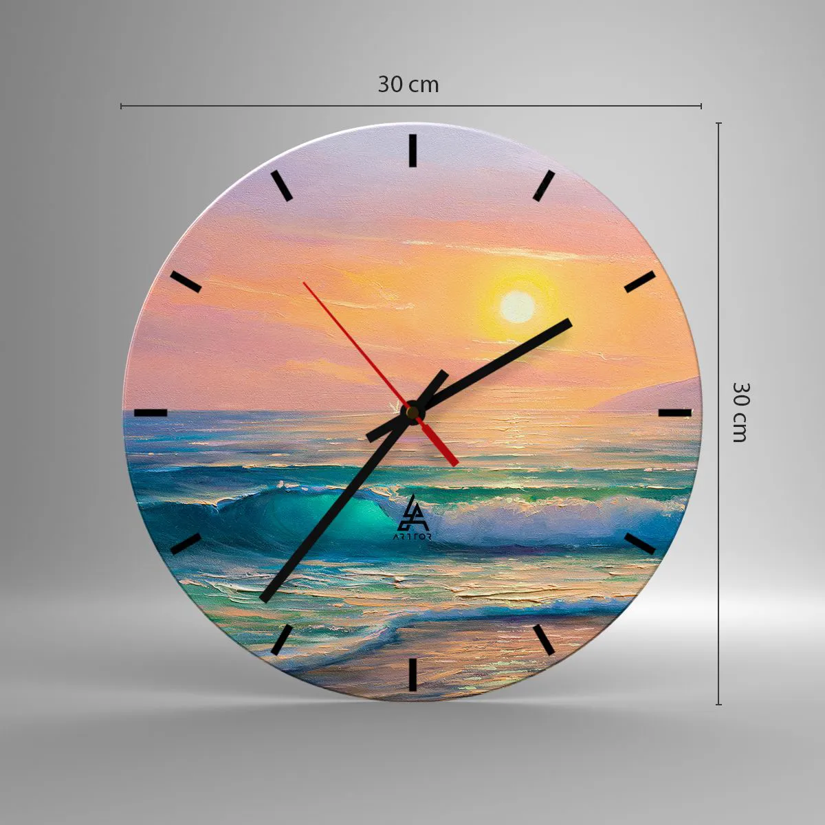 Ceas de perete - Ceas pe sticlă - Un apus de soare pitoresc peste un ocean calm - 30x30cm - Cântecul turcoaz al valurilor - Decorațiune modernă pentru perete pentru living, bucătărie și dormitor ARTTOR