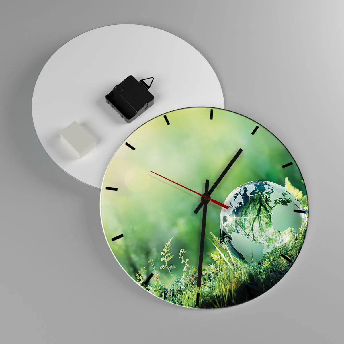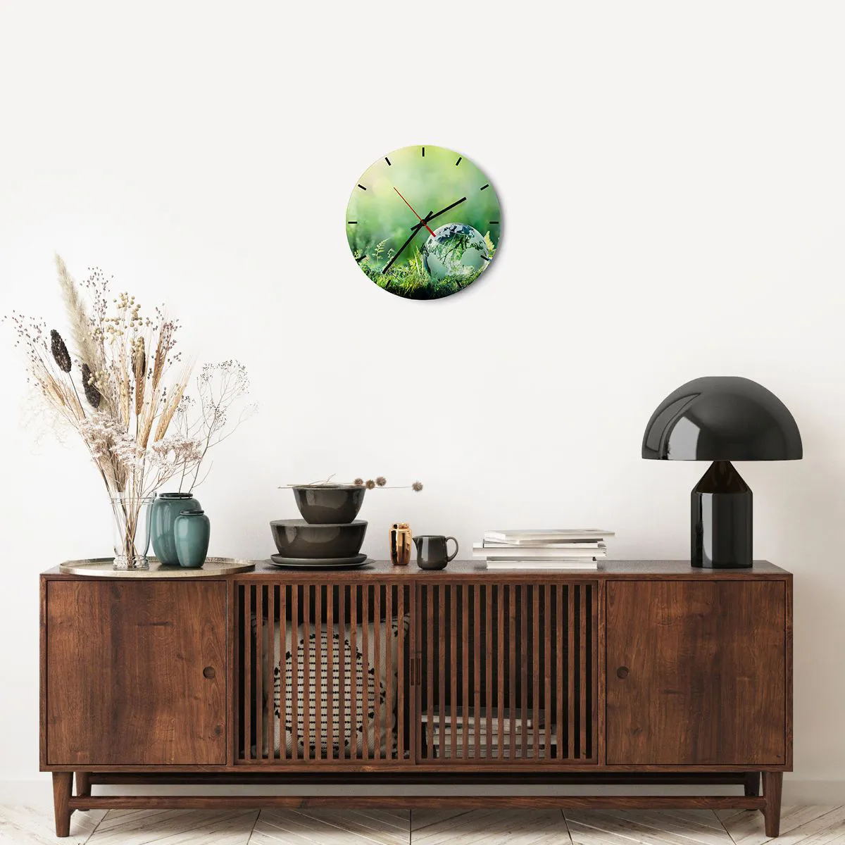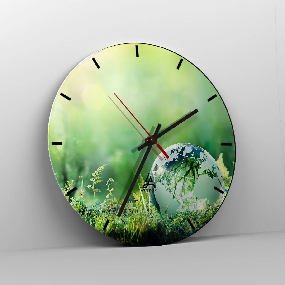 Ceas de perete - Ceas pe sticlă - O sferă de sticlă cu o hartă a lumii pe un fundal de natură verde - 30x30cm - Planeta verde - Decorațiune modernă pentru perete pentru living, bucătărie și dormitor ARTTOR