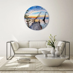 - Acest ceas de perete de 30x30 cm, realizat din sticlă rezistentă, înfățișează un dig pitoresc pe malul lacului în strălucirea soarelui apus. Perfect pentru interioare cu o atmosferă relaxantă și decorativă.