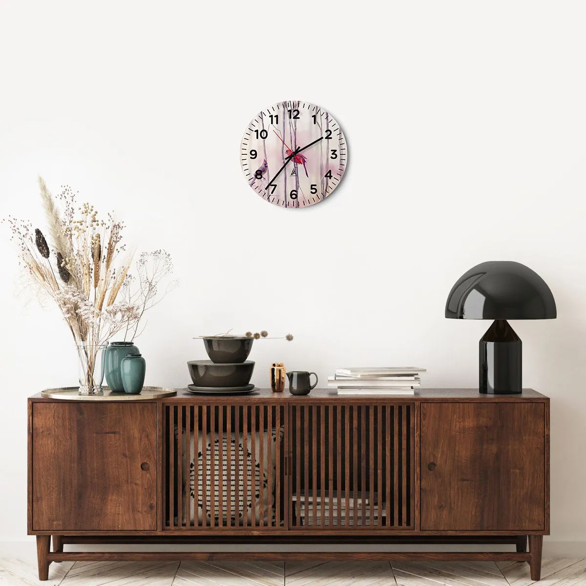 Ceasul pe sticlă este gata de agățat pe perete, este echipat cu un cuier metalic montat pentru o instalare ușoară