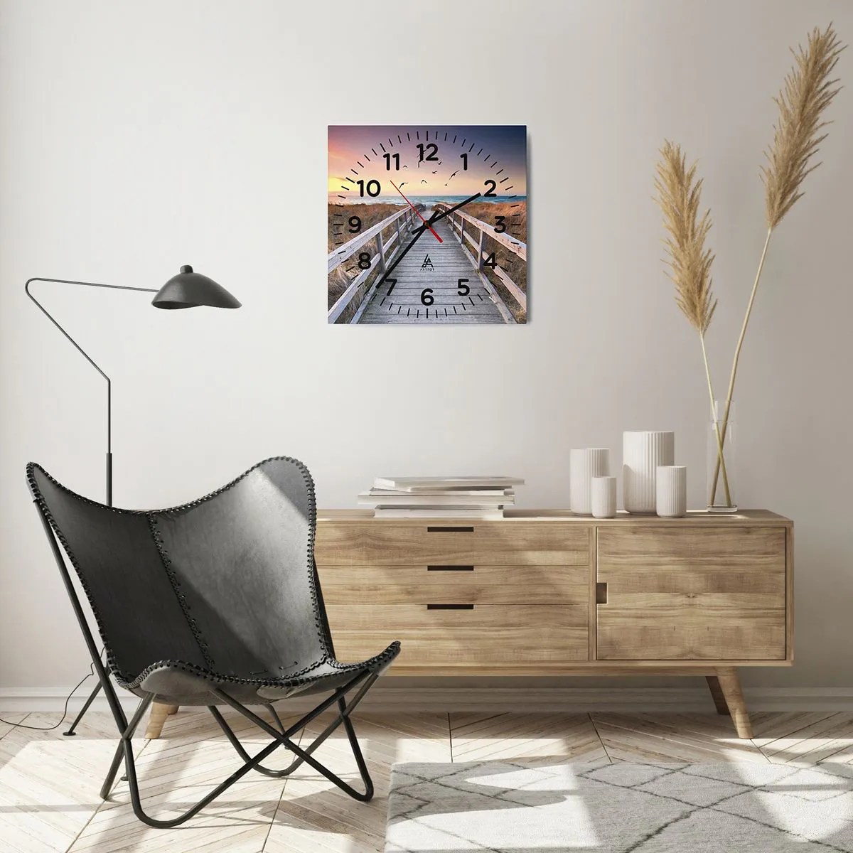 Ceasul pe sticlă este gata de agățat pe perete, este echipat cu un cuier metalic montat pentru o instalare ușoară