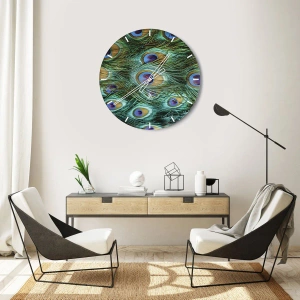 Ceas de perete - Ochi de păun - Pene de păun în nuanțe de verde și albastru
