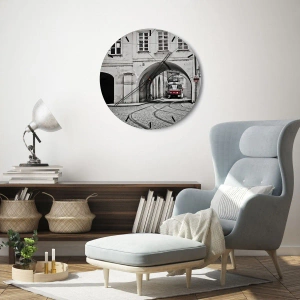 Ceas de perete - Prin labirintul urban - Un tramvai trece printr-un arc în stil monocrom