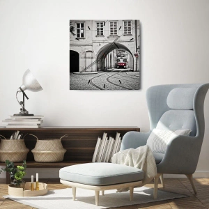 Ceas de perete - Ceas pe sticlă - Un tramvai care trece printr-un arc într-un stil monocromatic. - 30x30cm - Printr-un labirint urban - Decorațiune modernă pentru perete pentru living, bucătărie și dormitor ARTTOR