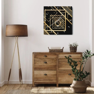 Ceas de perete - Ceas pe sticlă - Model geometric auriu pe fundal negru - 30x30cm - Geometrie de aur - Decorațiune modernă pentru perete pentru living, bucătărie și dormitor ARTTOR