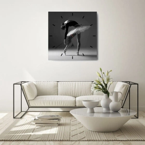 Ceas de perete - Ceas pe sticlă - Balerină alb-negru într-o poză de dans clasic - 30x30cm - Bella balerina - Decorațiune modernă pentru perete pentru living, bucătărie și dormitor ARTTOR