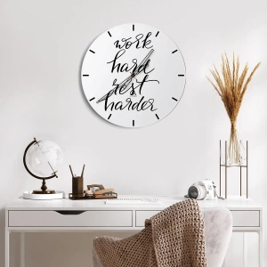 Ceas de perete - Life Balance - Inscripție alb-negru „muncește din greu, odihnește-te mai tare” pe fundal alb