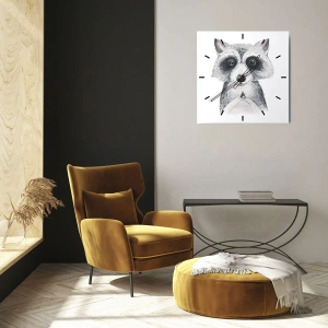 - O ilustrație delicată alb-negru a unui raton cu ochi mari și expresivi pe un fundal alb. Acest ceas cu un motiv fermecător și emoționant este perfect pentru interioarele confortabile.