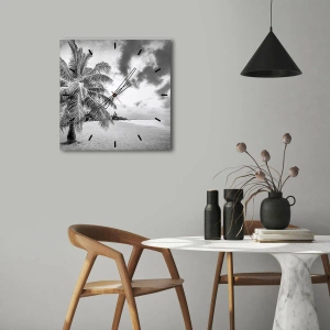 Ceas de perete - Ceas pe sticlă - Plajă cu palmieri în alb și negru - 30x30cm - Când tânjești după singurătate... - Decorațiune modernă pentru perete pentru living, bucătărie și dormitor ARTTOR