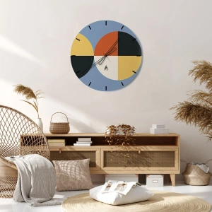 - Acest ceas de perete artistic de 30x30 cm prezintă o compoziție geometrică de semicercuri și pătrate în nuanțe de albastru, galben, cărămiziu și negru. Realizat din sticlă, este rotund și perfect pentru interioarele moderne.