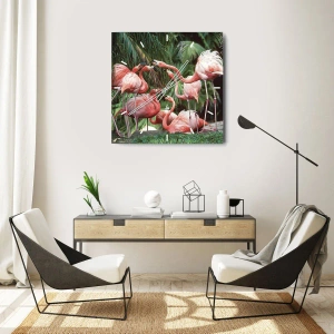 Ceas de perete - Ceas pe sticlă - Flamingi roz pe fundalul unei vegetații tropicale luxuriante - 30x30cm - Bârfa de după-amiază - Decorațiune modernă pentru perete pentru living, bucătărie și dormitor ARTTOR