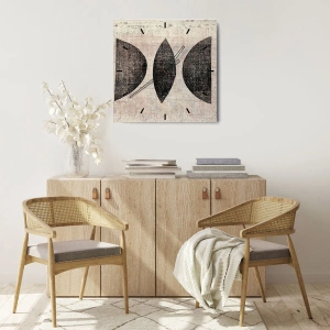 Ceasul de perete „Abstracție etnică” este o combinație de simplitate, austeritate și libertate artistică. Cadranul este dominat de o compoziție de forme geometrice negre – semicercuri și forme asemănătoare frunzelor – plasate pe un fundal cu o textură care amintește de pânza naturală. Efectul amintește de motivele pictate manual, inspirate de arta tribală și modelele etnice, dominate de contraste și forme organice.