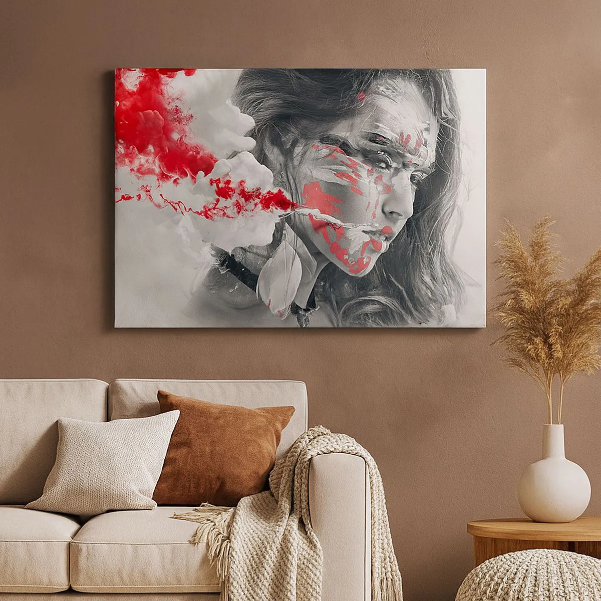 Tablou pe pânză Canvas - Portret artistic al unei femei cu accente roșii abstracte - 70x50cm - În aburul absurdului - Decorațiune modernă pentru perete pentru living și dormitor ARTTOR