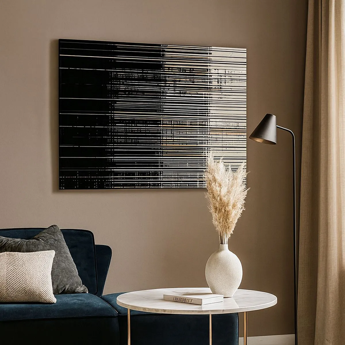 • Pictura înfățișează o compoziție abstractă de linii în contrast cu alb-negru. O decorațiune modernă care introduce minimalism și armonie în interior.
