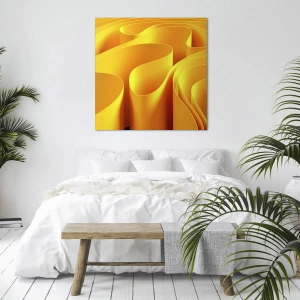 - Pictura înfățișează valuri abstracte galbene care amintesc de razele soarelui, aducând căldură și energie interioarelor moderne.