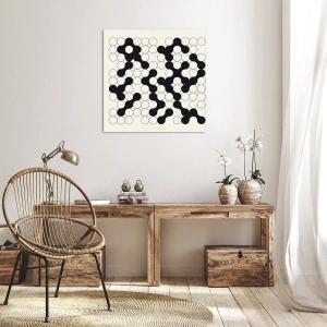 Tabloul „Joc chinezesc - variație” este o operă de artă unică, care se distinge prin simplitatea și designul său modern. Modelele geometrice cu cercuri alb-negru creează o compoziție armonioasă ce atrage atenția și adaugă eleganță interiorului. Estetica minimalistă face ca acest tablou să se potrivească perfect designurilor interioare contemporane.
