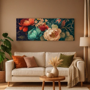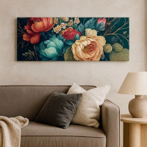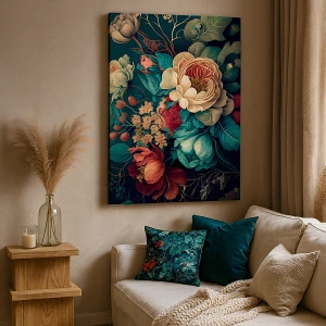 Tablou pe pânză Canvas - O compoziție colorată de flori pe un fundal întunecat - 70x50cm - Farmecul secolului al XIX-lea - Decorațiune modernă pentru perete pentru living și dormitor ARTTOR
