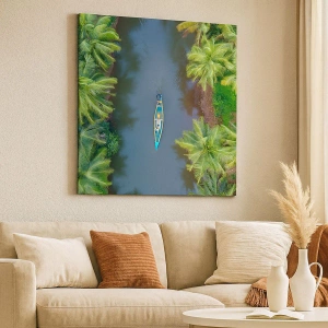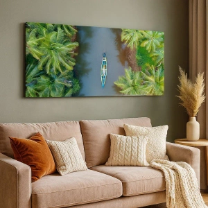Tablou pe pânză Canvas - O vedere de sus a unei bărci pe un râu înconjurată de palmieri - 70x50cm - Pe traseul tropical - Decorațiune modernă pentru perete pentru living și dormitor ARTTOR
