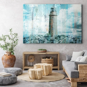 - Pictura înfățișează un far cocoțat pe o coastă stâncoasă, înconjurat de nuanțe pastelate de cer și mare, creând un peisaj liniștit și armonios. O alegere perfectă pentru interioare elegante.