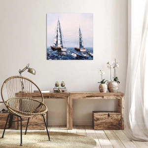 - Bărci cu pânze pe o mare furtunoasă, prezentate într-o compoziție picturală. O decorațiune perfectă pentru iubitorii de peisaje marine și artă.