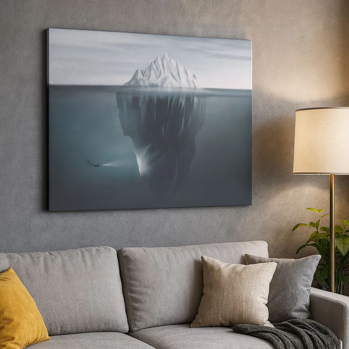 Tablou pe pânză Canvas - Un aisberg în apă cu un scafandru și un reflector sub suprafață. - 70x50cm - Un mister subacvatic - Decorațiune modernă pentru perete pentru living și dormitor ARTTOR